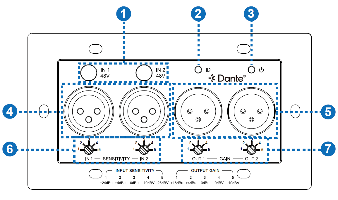 ① 1x 2x 입력 및 2x 출력 아날로그 XLR-Dante® 변환기